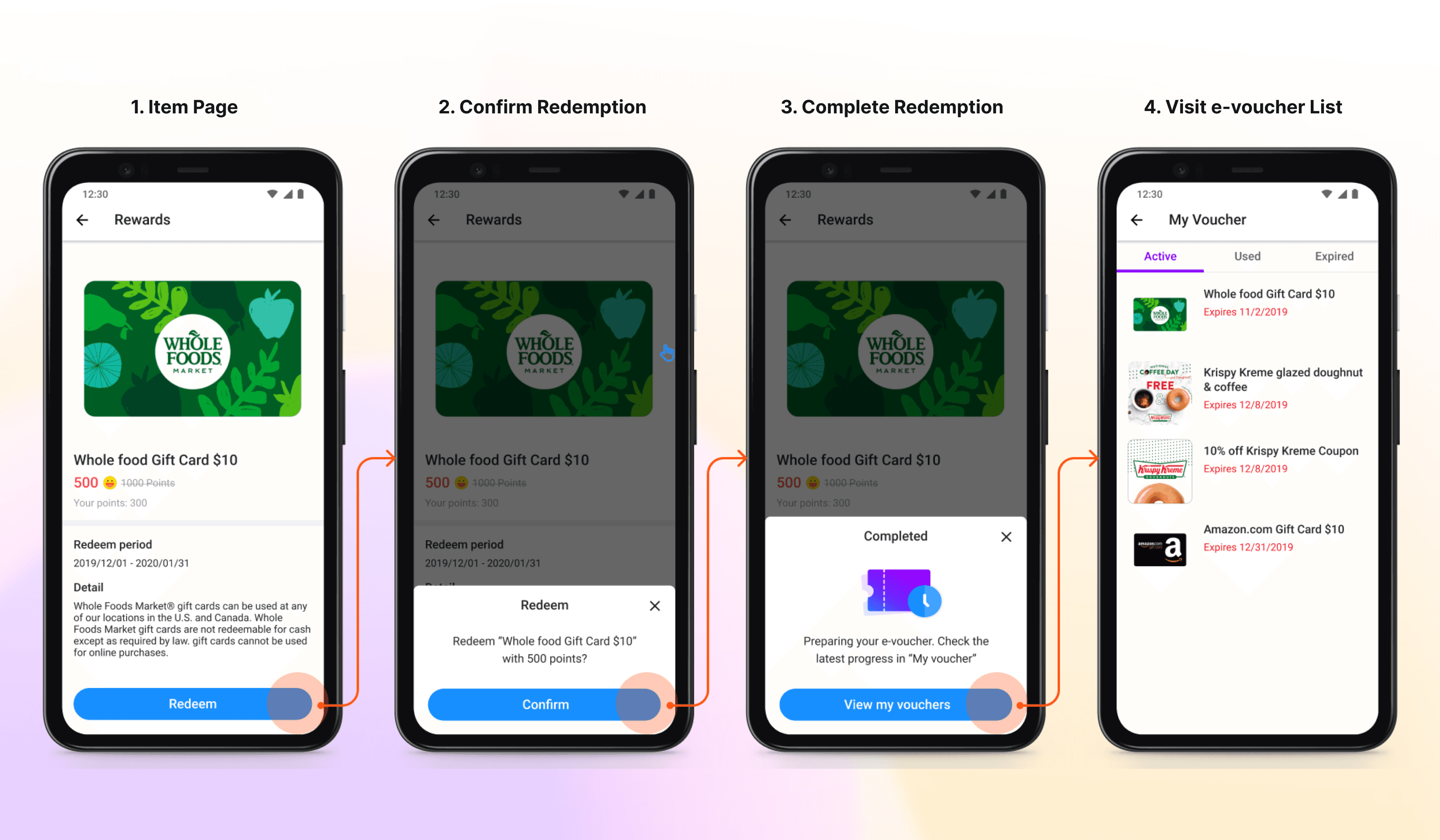 The redemption flow in Yahoo App: from selecting a reward to accessing the e-voucher.
