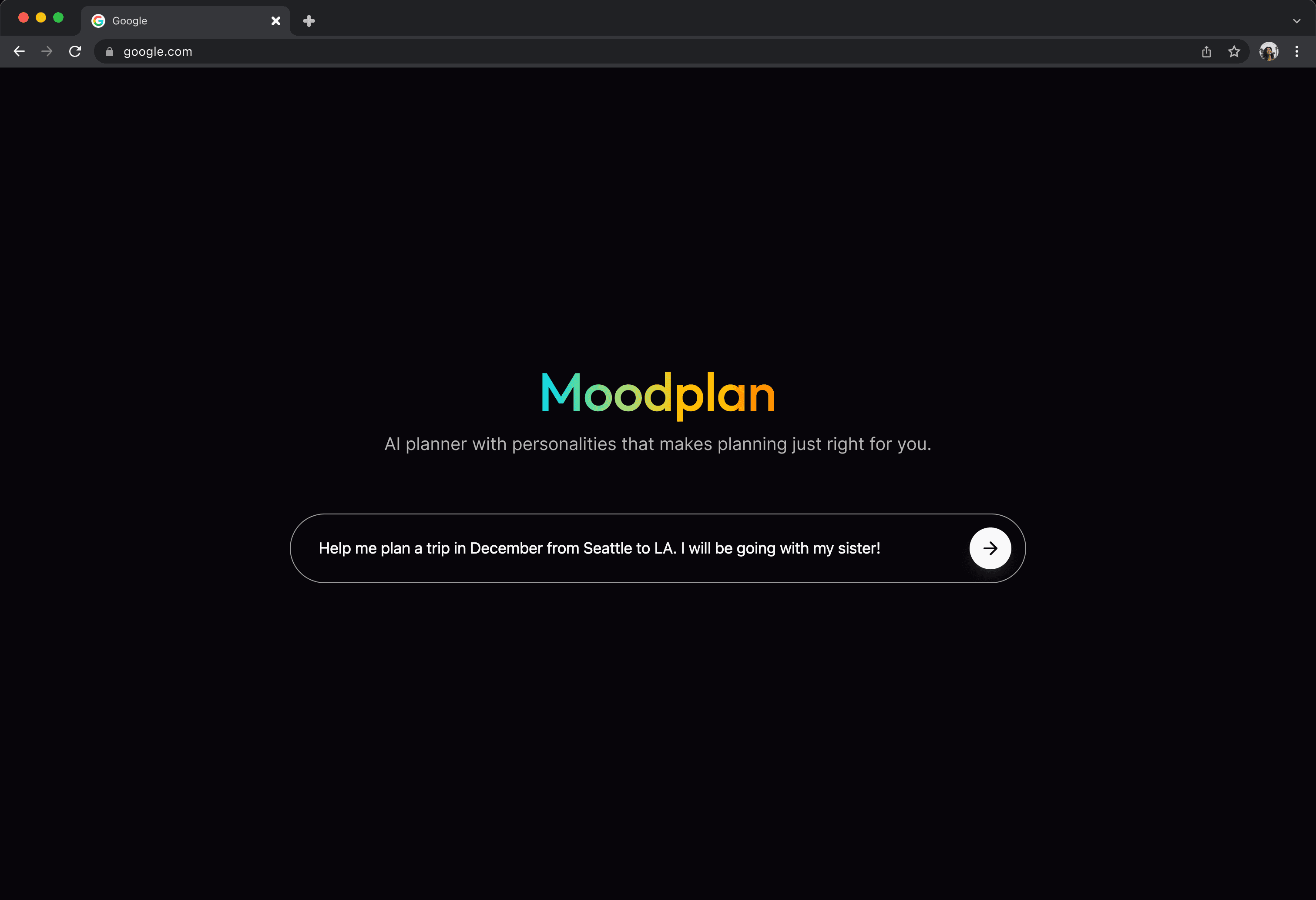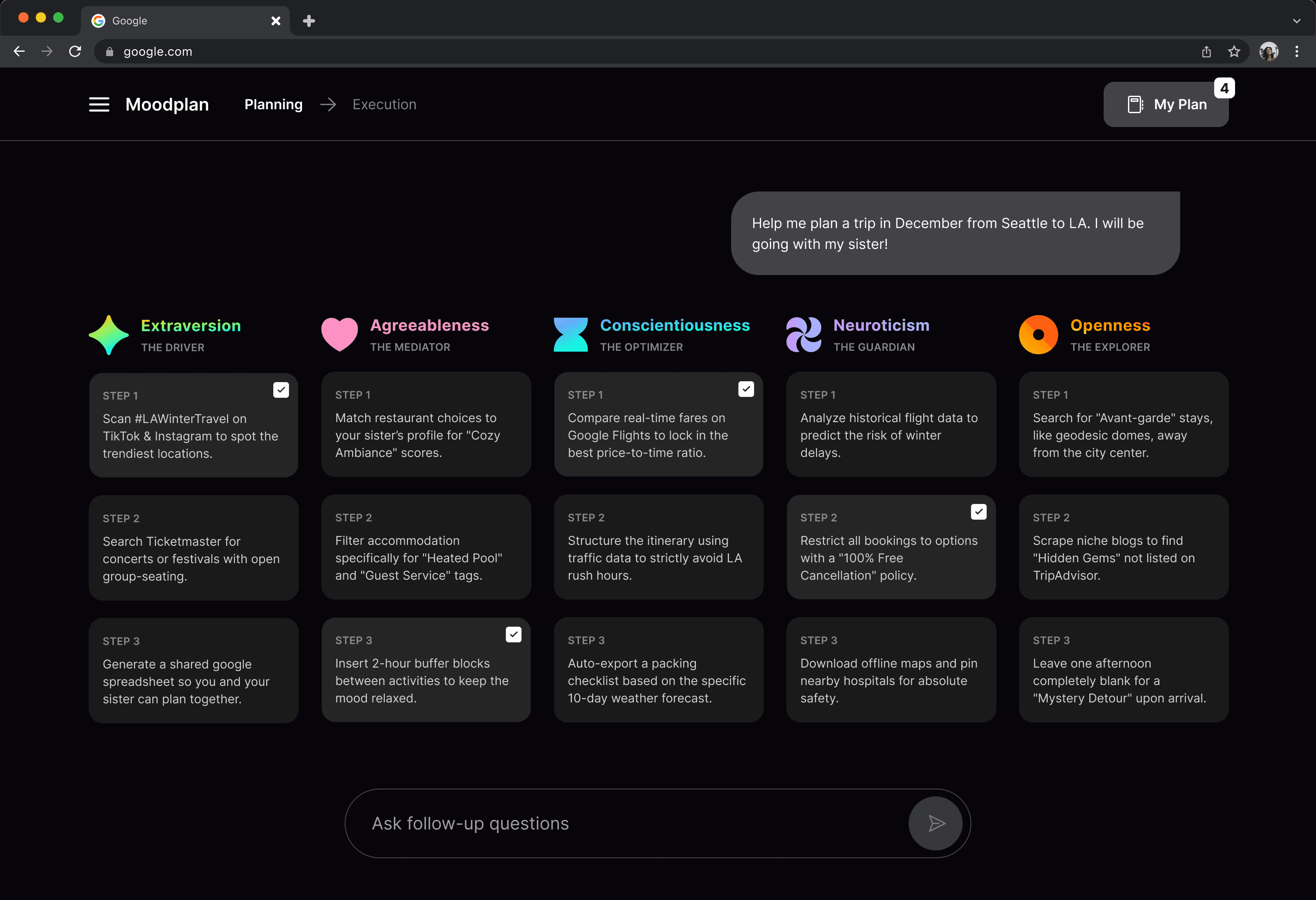 The first iteration was an AI agent that generates plans based on different personality traits. However, I was not satisfied that users could only select an entire plan from a single personality.