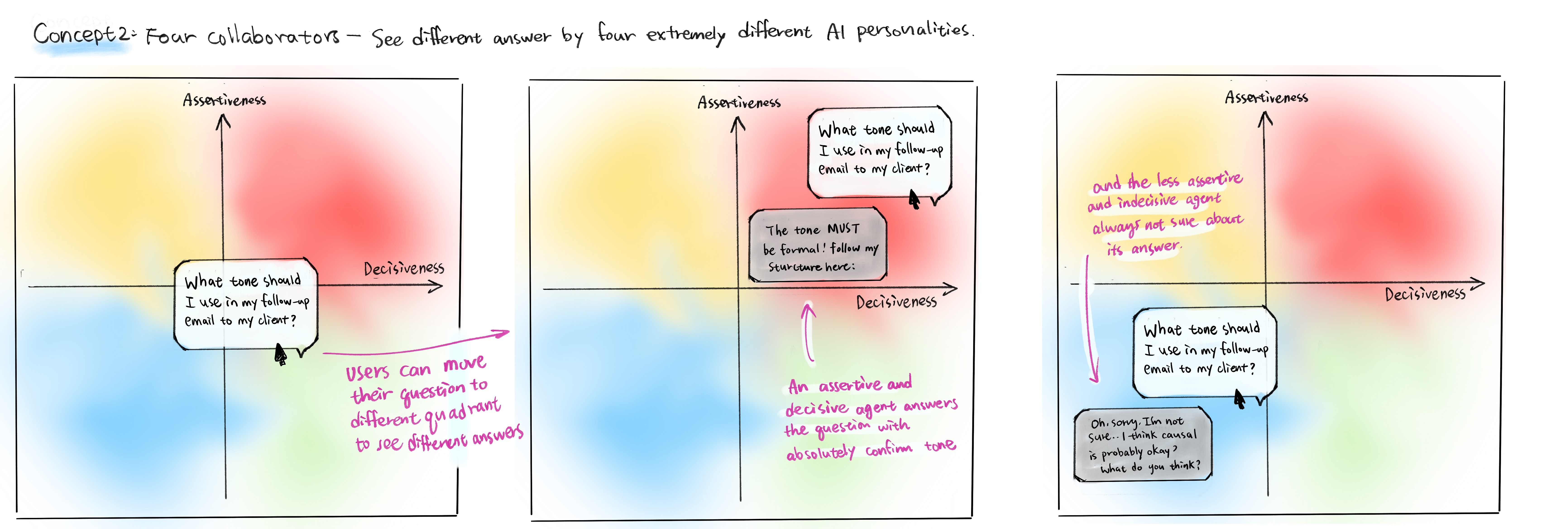 I moved forward with the "Four Collaborator" concept, where users can drag prompts to see extreme responses from different perspectives.