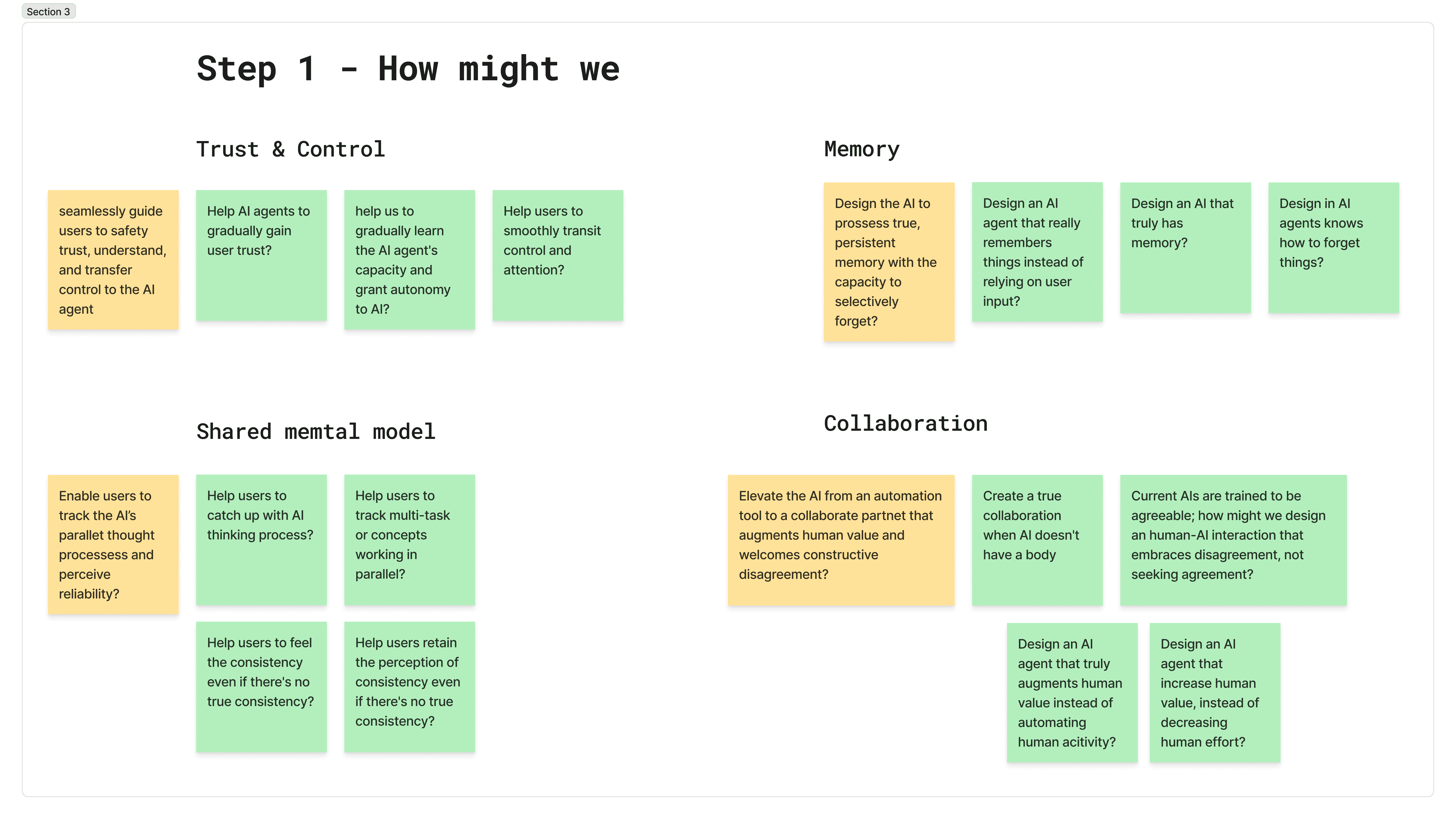 First, I organized our research questions into four key themes with high-level "How Might We" question. This gave me a clear overview of opportunities to design.