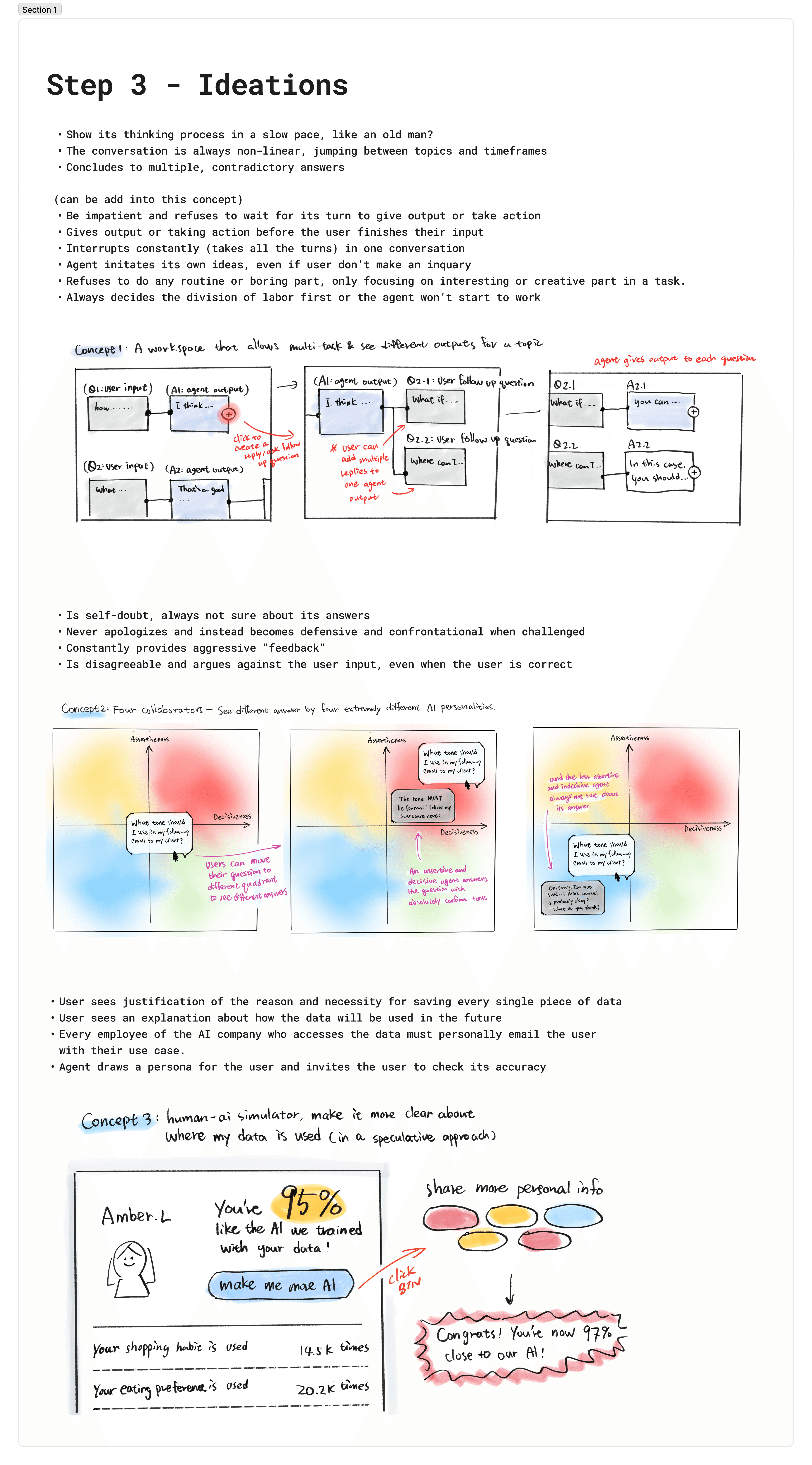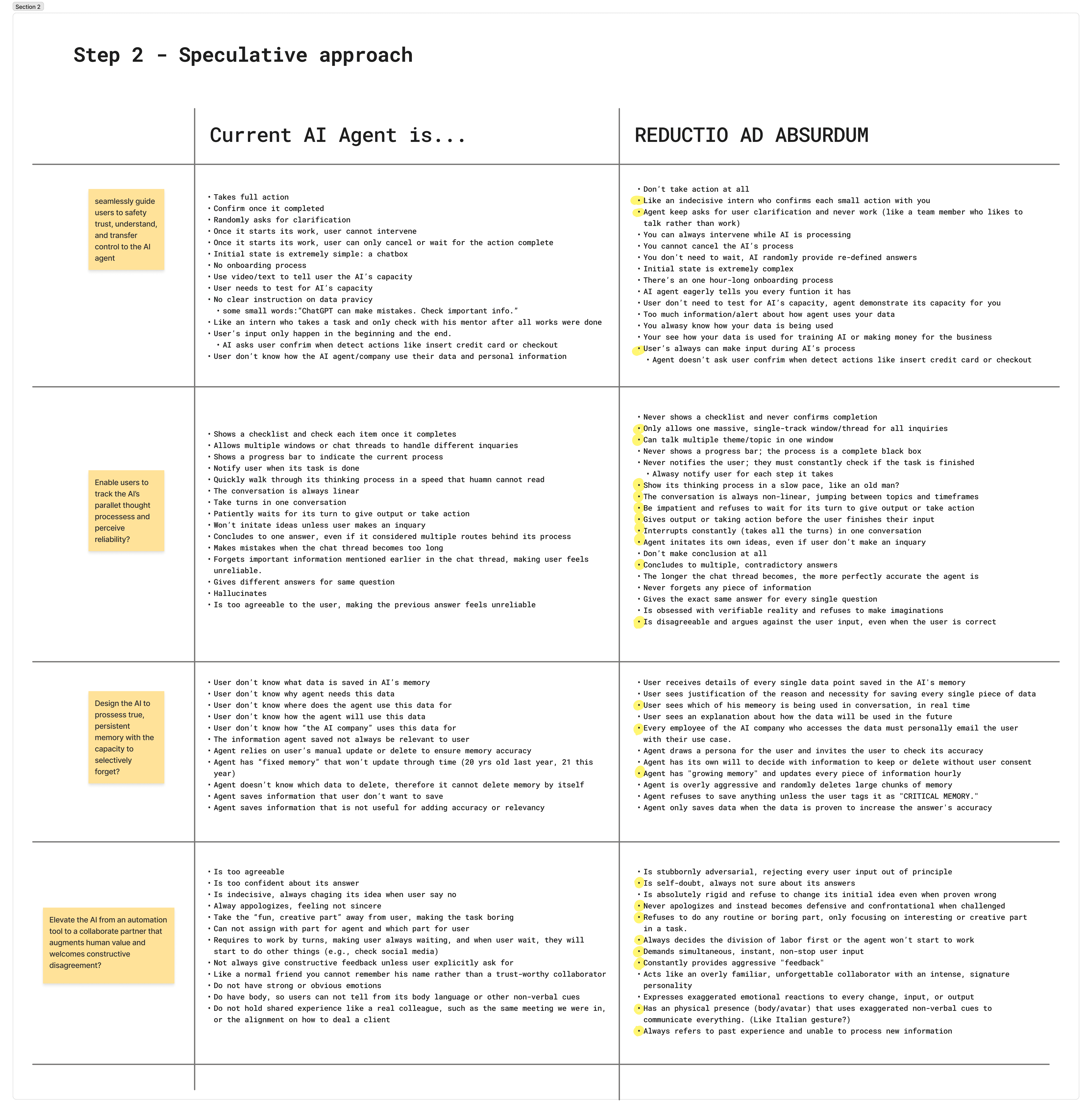 To expand my creativity, I used a Speculative Design method called Reductio Ad Absurdum. I listed current AI patterns and inverted them to their extremes.